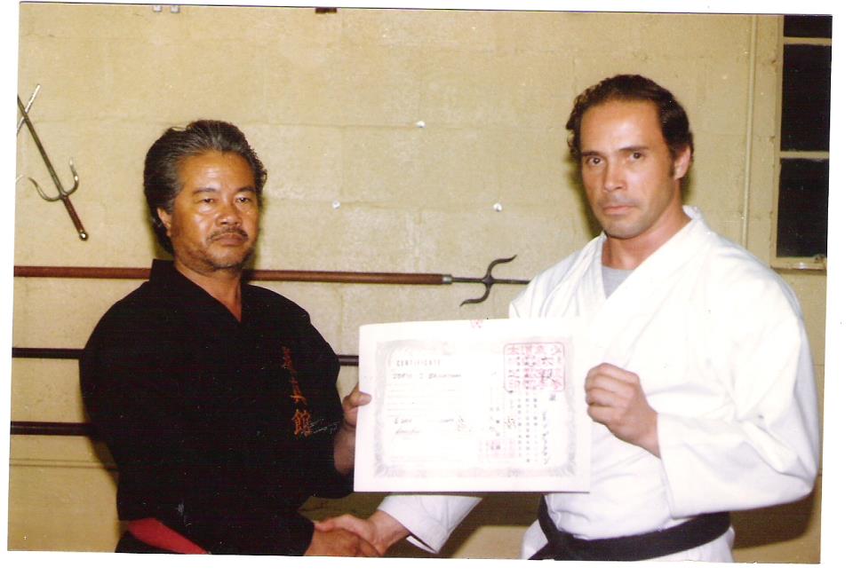 El 9 de diciembre de 1978, recibe el 1º Dan, mediante diploma expedido por Hanshi Katsuya Miyahira (10º Dan), reconocido alumno de Choshin Chibana.